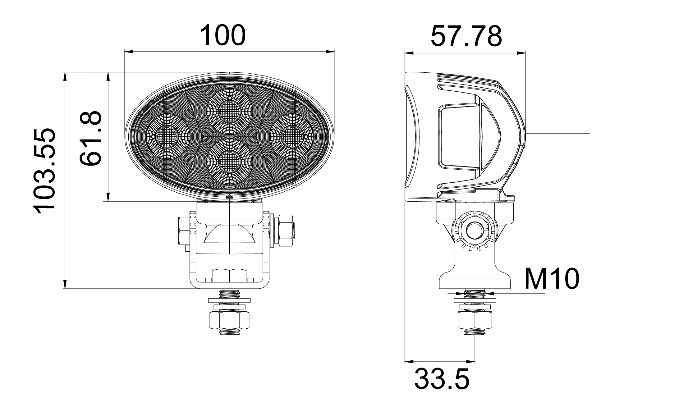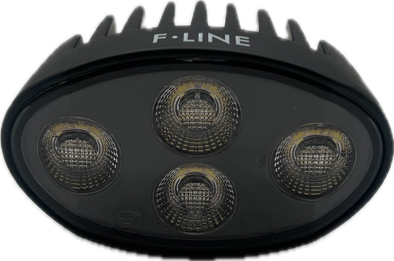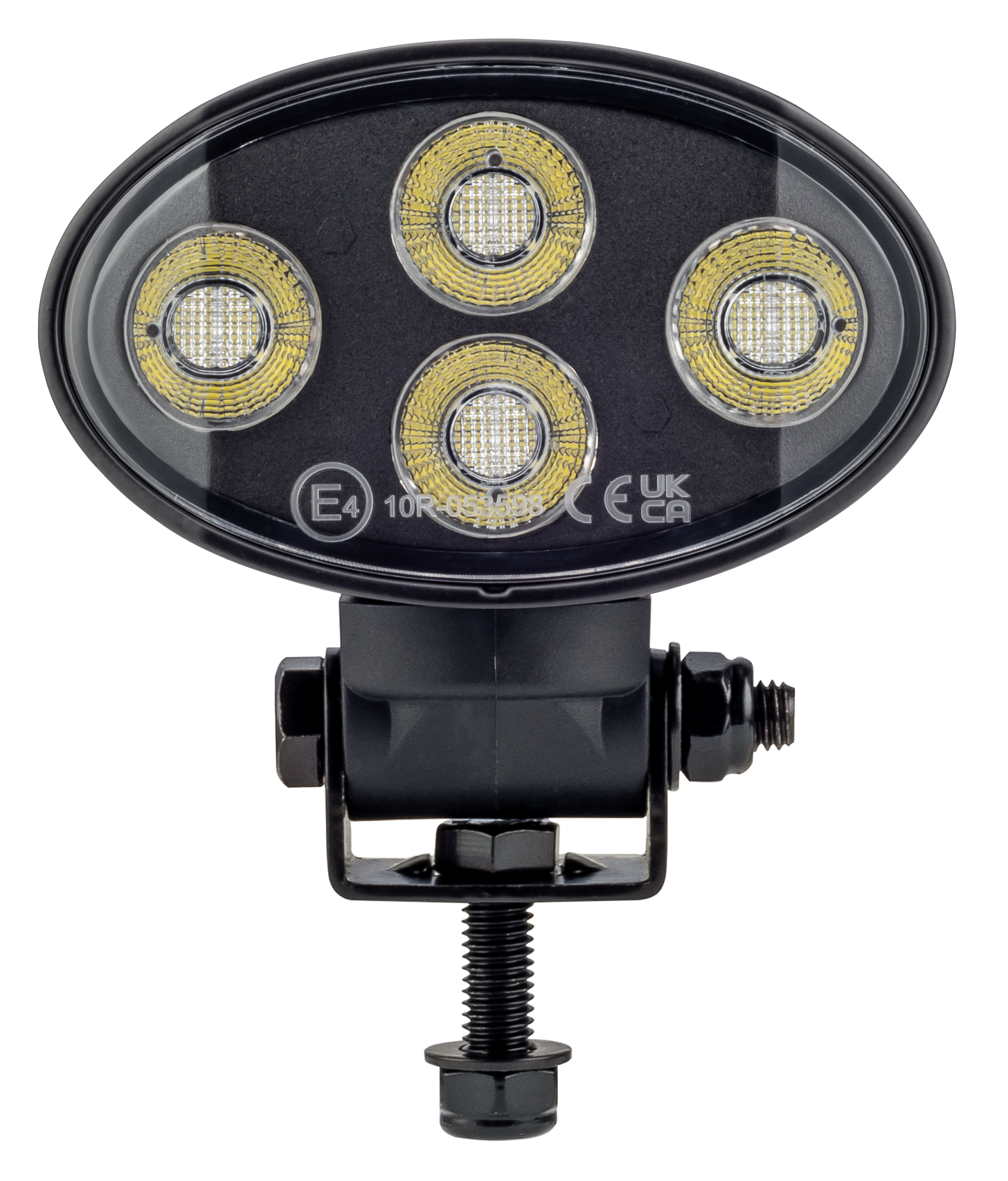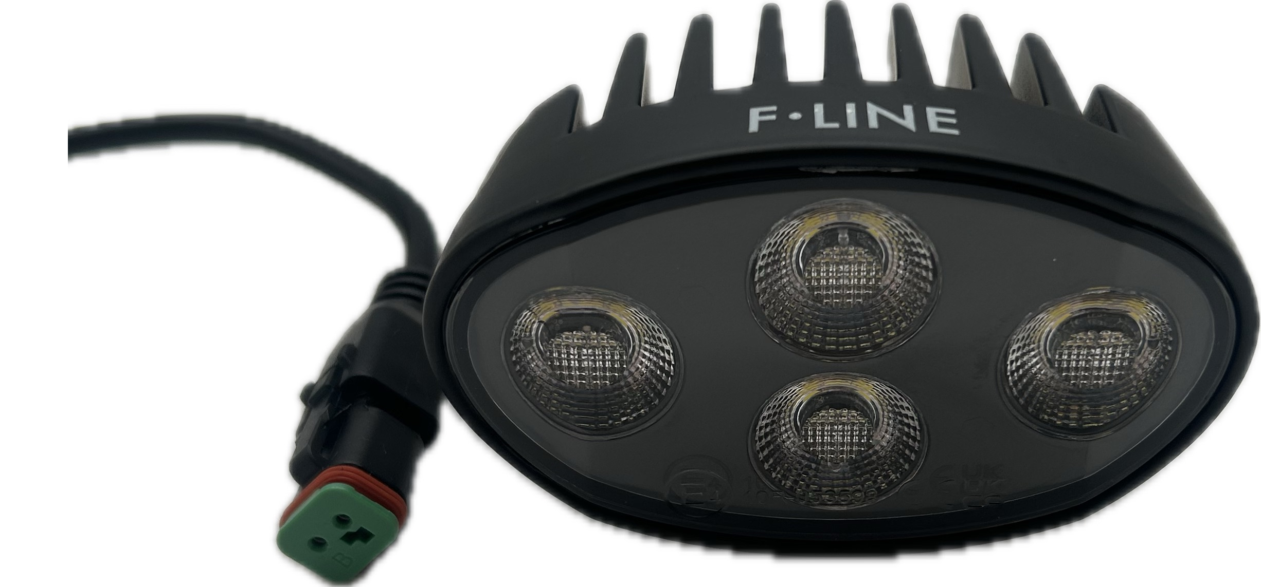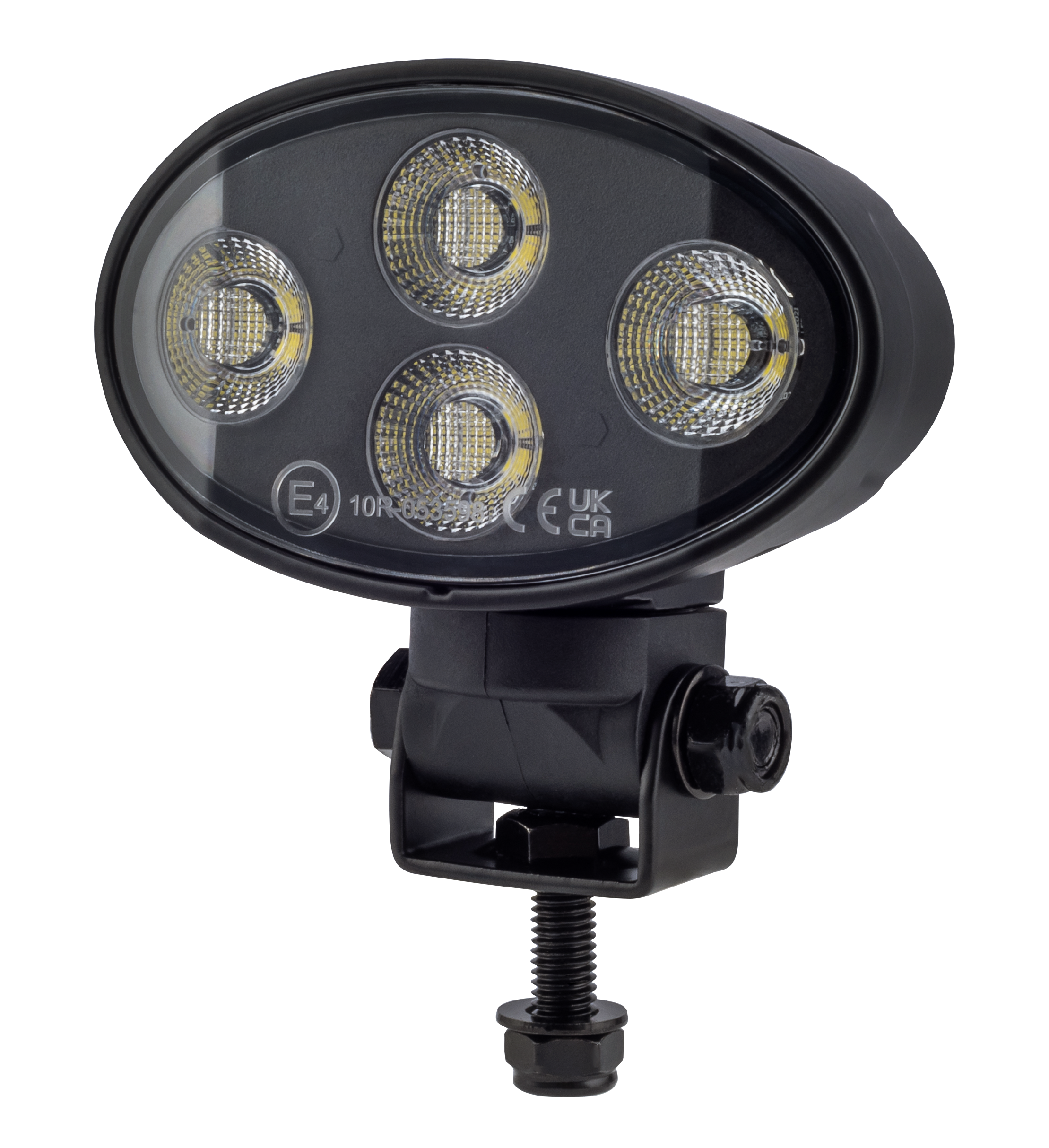 Oval LED arbejdslampe med lygtehus i sortlakeret aluminium, linse af polycarbonat med varme i glasset, samt beslag af rustfrit stål. Indbygget DT stik.